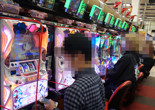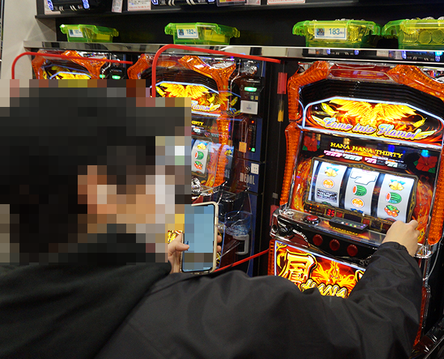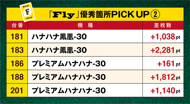 並びで設置された「ハナハナ鳳凰-30」と「プレミアムハナハナ-30」にも飛び飛びでプラスptとなる場所があり、そのうちの4台は+1000ptを上回った。