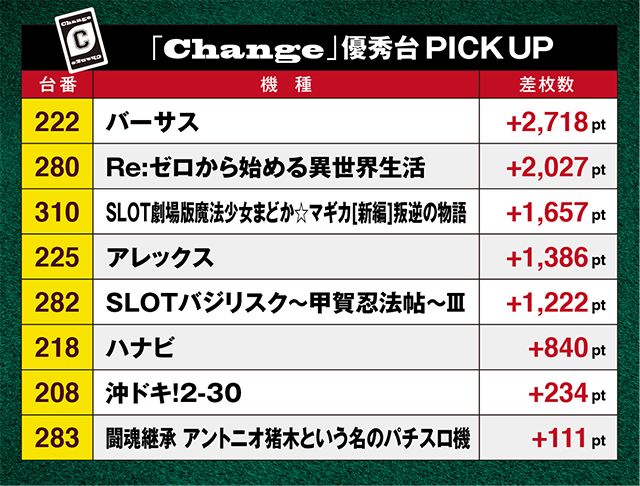 ほかにも、「アレックス」の225番台や「ハナビ」の218番台がプラスptを記録!!