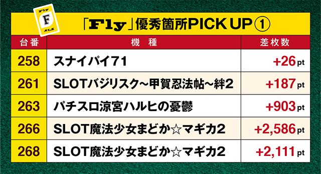 258番台の「スナイパイ71」から「SLOT魔法少女まどか☆マギカ2」の268番台までの11台が1台飛ばしでプラスpt!