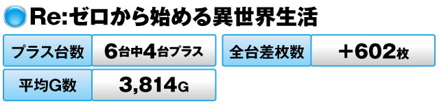 その他では、『パチスロ トータル・イクリプス2』、『ハナビ』、『Re:ゼロから始める異世界生活』が盛り上がっていたが、3台いずれも安定感が目立っていた。
