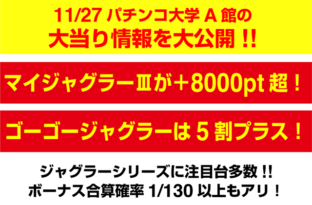 11月27日、「パチンコ大学A館」のパチスロコーナーはトータル差枚数+4000ptオーバー。