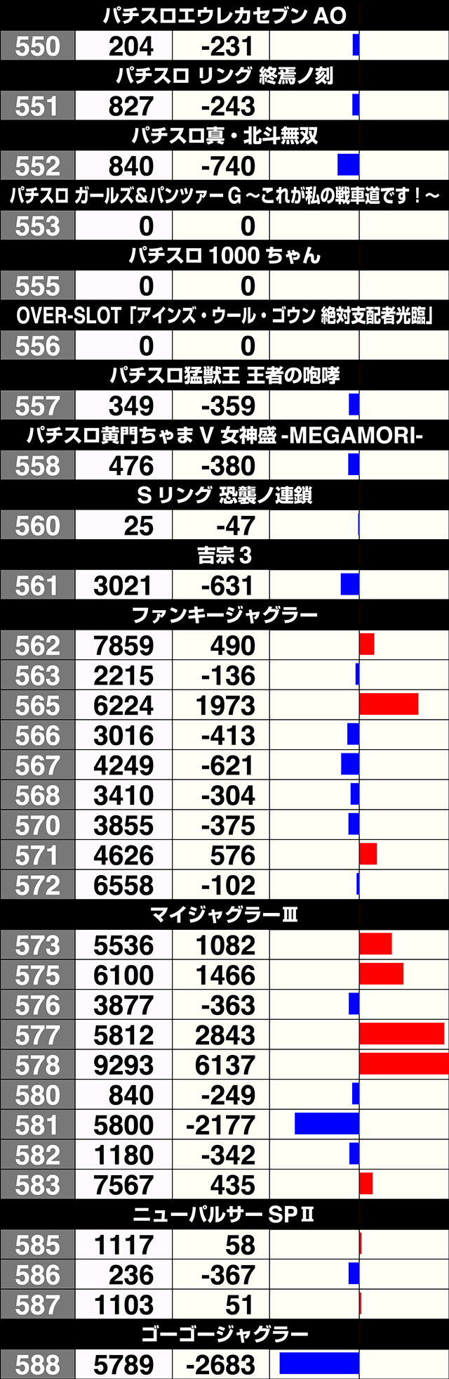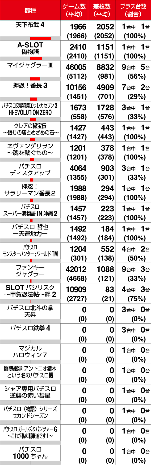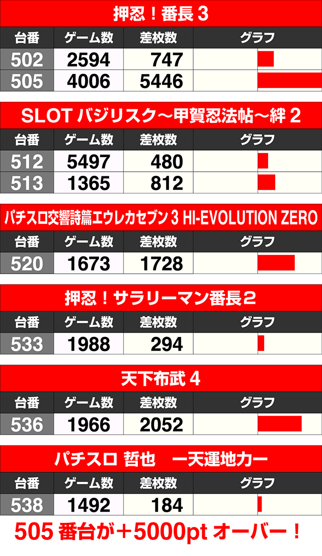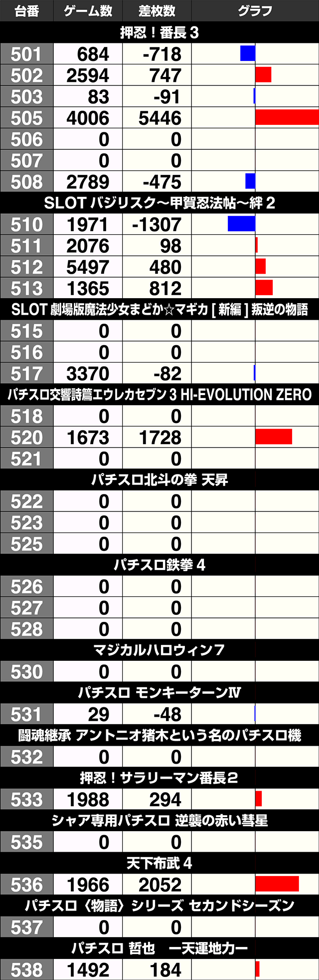 設置台数が1台の機種にも見所があり、536番台の『天下布武4』が+2000ptオーバー。