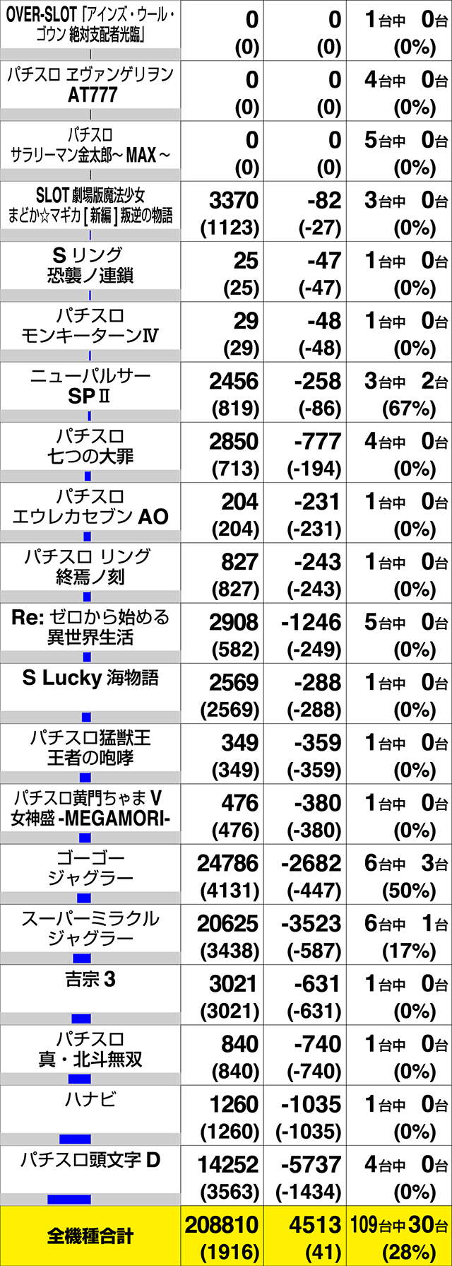 半数以上がプラスを記録した『マイジャグラーⅢ』を筆頭に、ジャグラーシリーズに好調台が目立った。