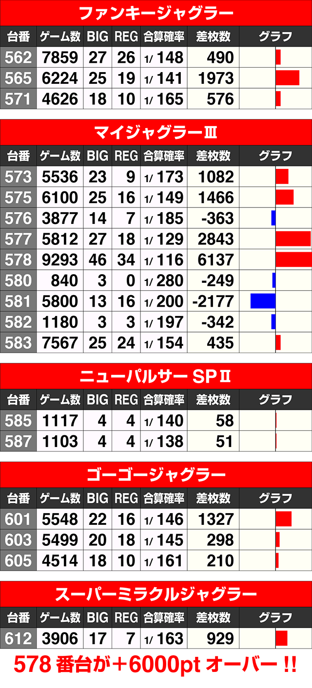 『ファンキージャグラー』は3台がプラスで、トータル差枚数は1000pt超。『ゴーゴージャグラー』は5割がプラスで、2台のゲーム数が5000Gを上回るほどに支持を集めた。