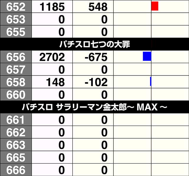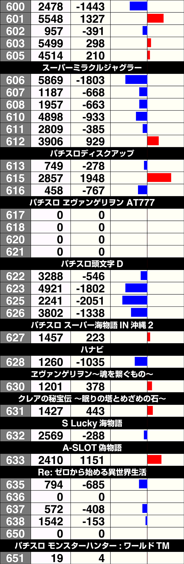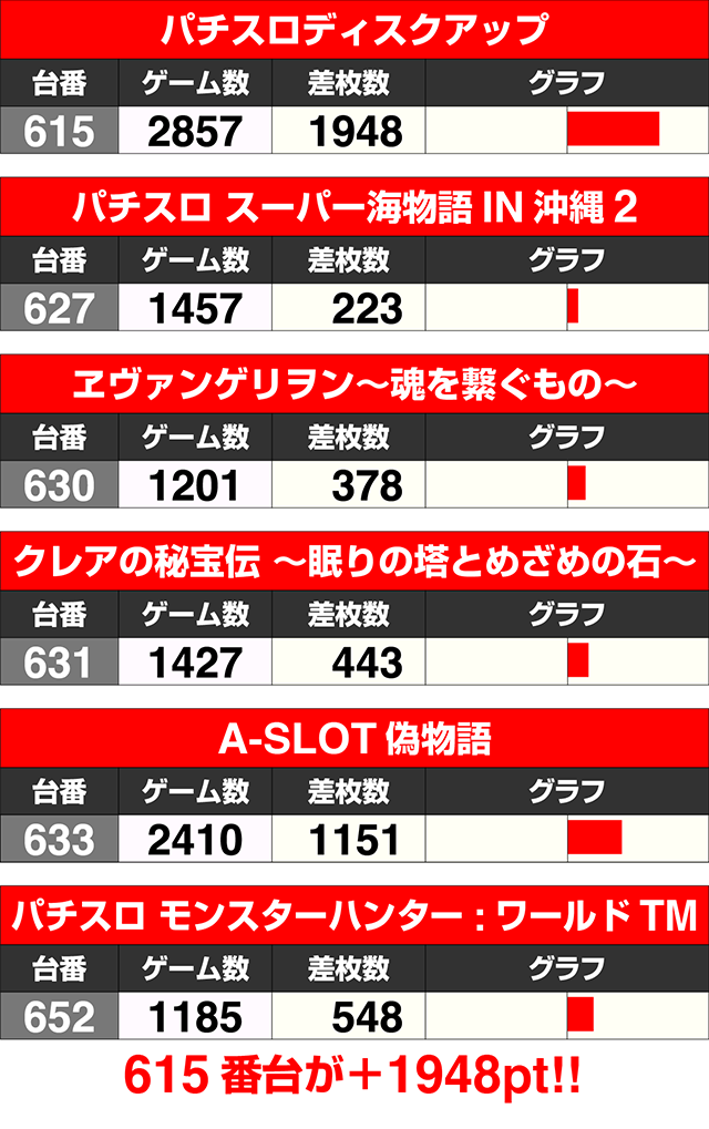 ボーナスタイプでは、631番台の『パチスロ スーパー海物語IN沖縄2』と633番台の『A-SLOT偽物語』がプラスであった。