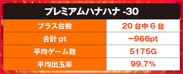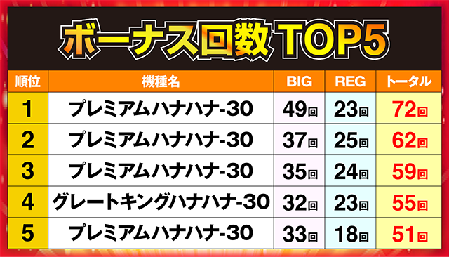 「プレミアムハナハナ-30」から4台がTOP5入りをはたし、ボーナス回数72回を記録した1台がダントツ!