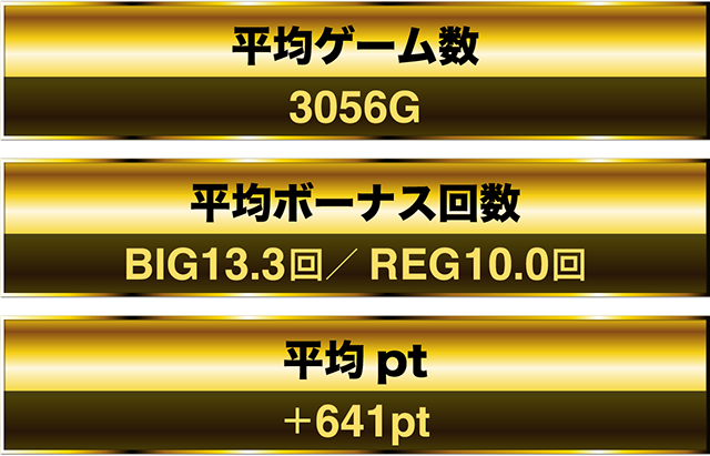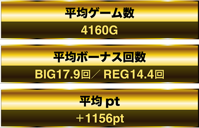 最終的な平均ゲーム数は4160Gで、平均ボーナス回数は約32回。平均ptは+1000ptを上回った。