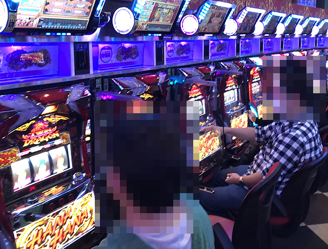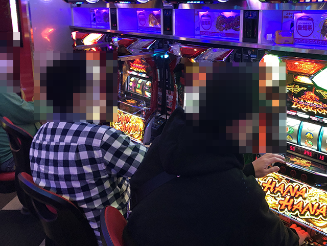 15時半を過ぎた頃の「ツインドラゴンハナハナ-30」では、5名のプレイヤーがイキイキと遊技をおこなっていた。