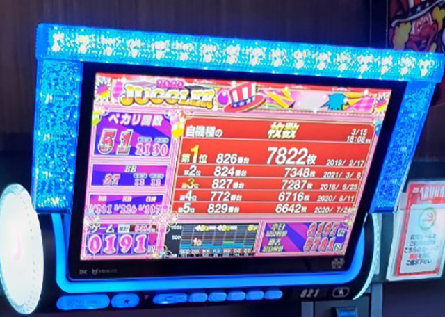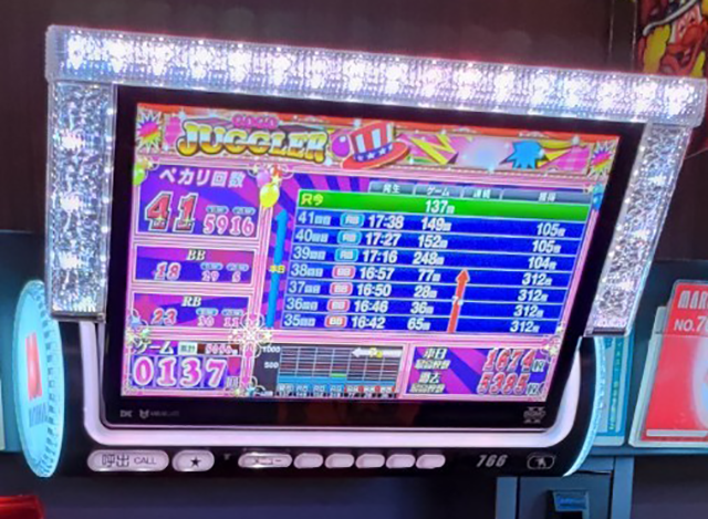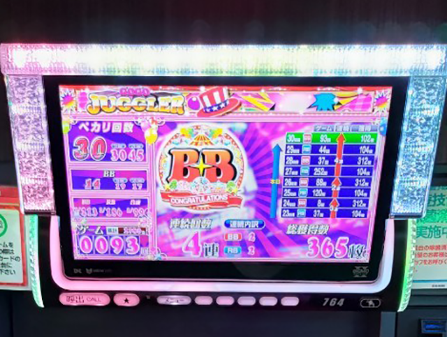 『ゴーゴージャグラー』では、4台が30回以上のボーナスに当選していた。