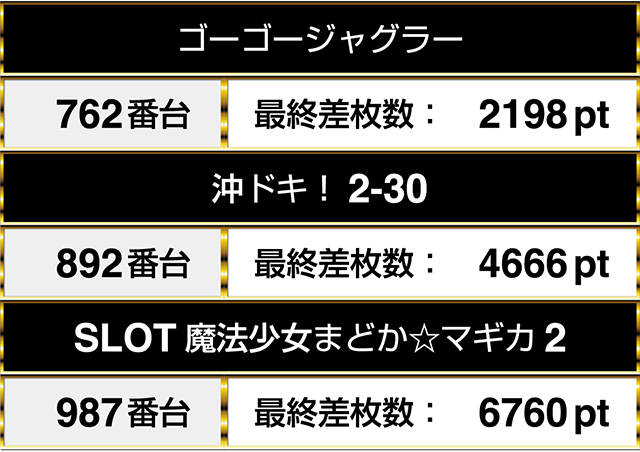 『沖ドキ!2-30』の892番台は4000ptを上回り、『SLOT魔法少女まどか☆マギカ2』の987番台は6000ptオーバー!!