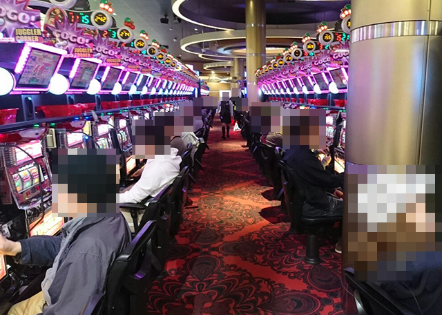 高稼働の『マイジャグラーⅣ』に楽しげなプレイヤーがズラリと並ぶ!!
