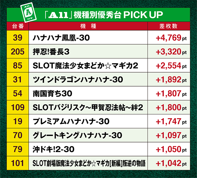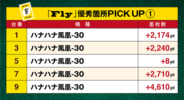 「ハナハナ鳳凰-30」の3台が前日の成績から大幅アップ!
