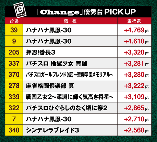 「押忍!番長3」や「パチスロひぐらしのなく頃に祭2」などにも+2000pt以上のデータがあるなど、さまざまな機種が華麗なる“Change”を遂げた。