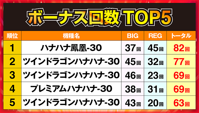 3機種が入り乱れるランキングの頂点に立ったのは、82回を記録した「ハナハナ鳳凰-30」の1台であった。