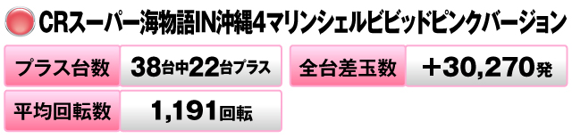 38台中22台がプラスで全台差玉数は+30,270発をマークした。