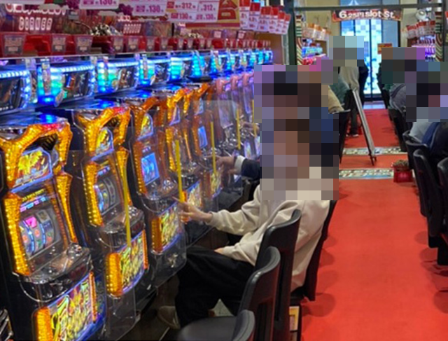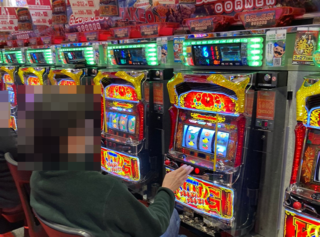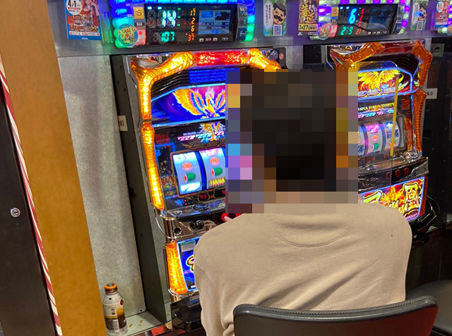 15時半ごろにパチスロをみると、さまざまな機種に笑みを浮かべている姿があった。