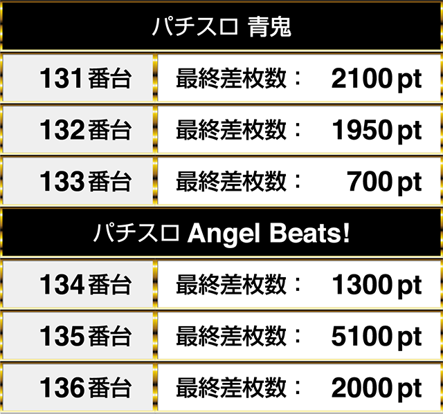 2機種を通してみると、131番台から136番台までの6台が並んでプラスptを記録した。