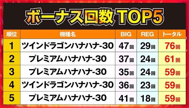 70回以上のボーナスに当選した「ツインドラゴンハナハナ-30」の1台が首位を獲得!!