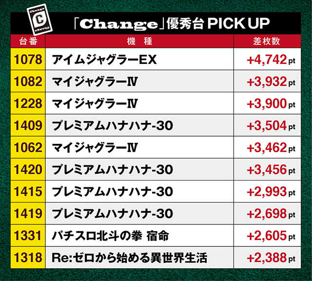 「パチスロ北斗の拳 宿命」と「Re:ゼロから始める異世界生活」にも+2000pt以上の台があるなど、AT機にも目をひかれる要素があった。