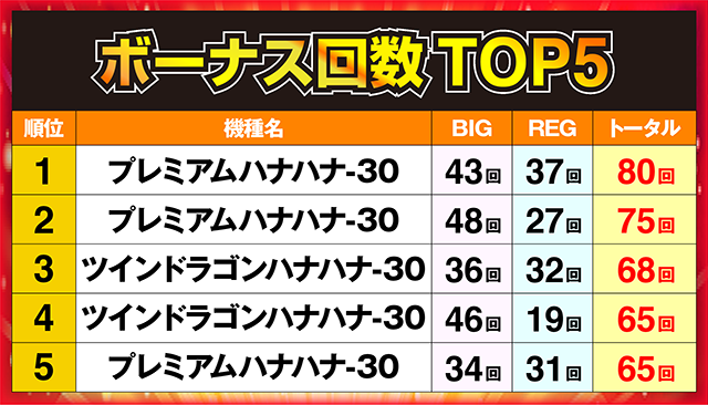 「ツインドラゴンハナハナ-30」も2台がTOP5に入り、どちらもボーナスは60回以上であった。