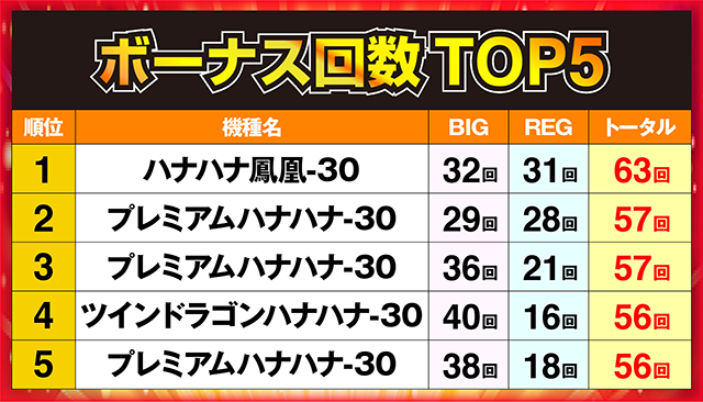ボーナス回数63回を記録した「ハナハナ鳳凰-30」の1台がトップを独走!