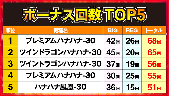 TOP5入りをはたしたのは3機種で、上位2台のボーナス回数は60回オーバー!