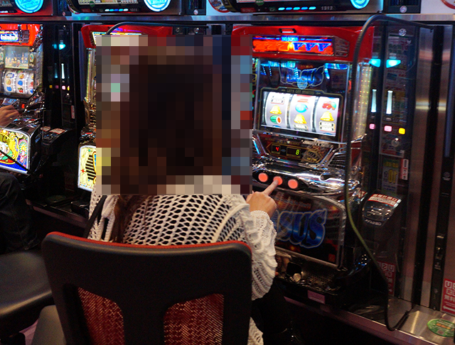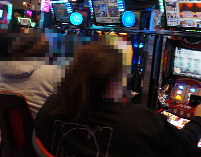 となりの「パチスロ ゴッドイーター ジ・アニメーション」でも楽しげな姿がみられ、遊技を満喫しているように思えた。