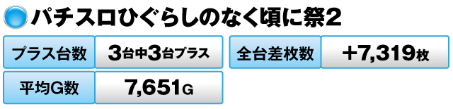 3台すべてがプラスで全台差枚数が+7,319枚、平均G数は7,651Gを記録。