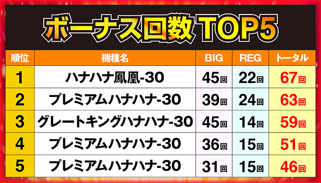 3機種の名前が並ぶランキングで、ボーナス回数67回の「ハナハナ鳳凰-30」が1位を獲得!