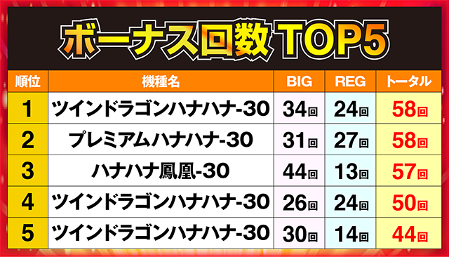 なかでも、「ツインドラゴンハナハナ-30」は3台もランクインしており、58回を記録した1台が首位を獲得した。