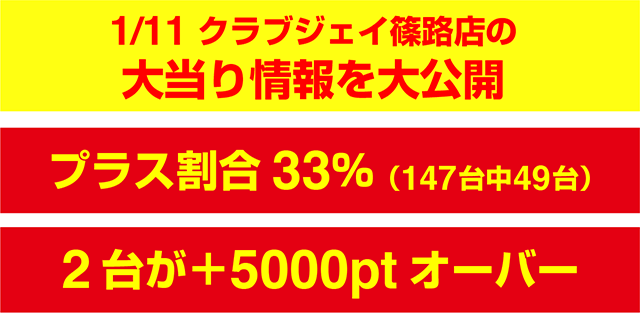 1月11日、「クラブジェイ篠路店」のパチスロは、全体の33%がプラスを記録した。