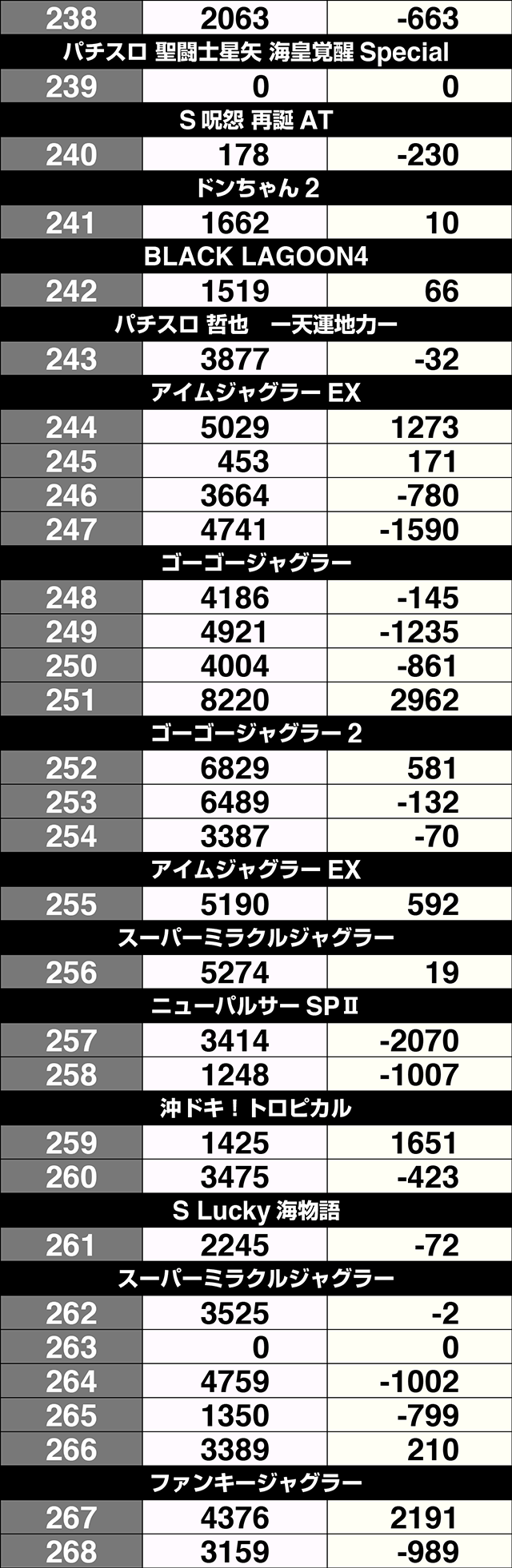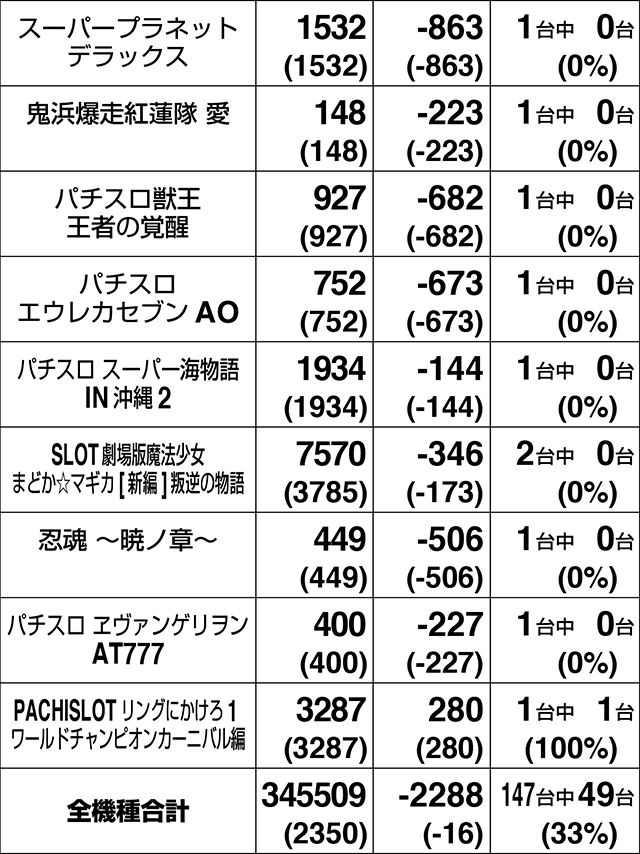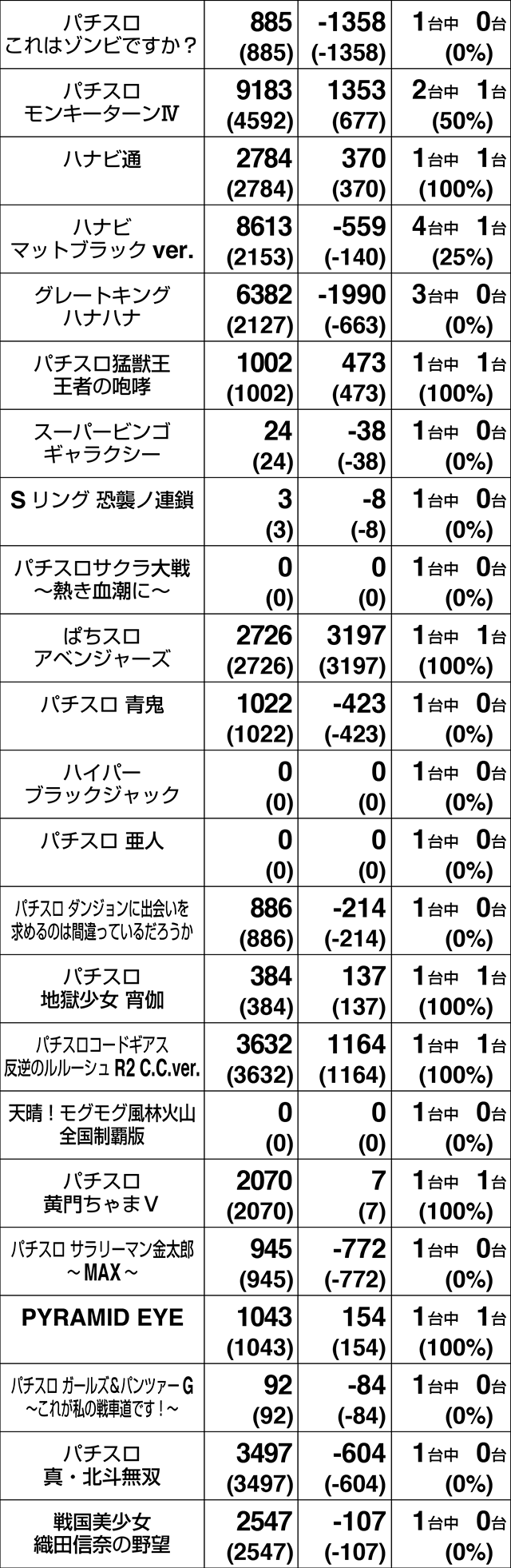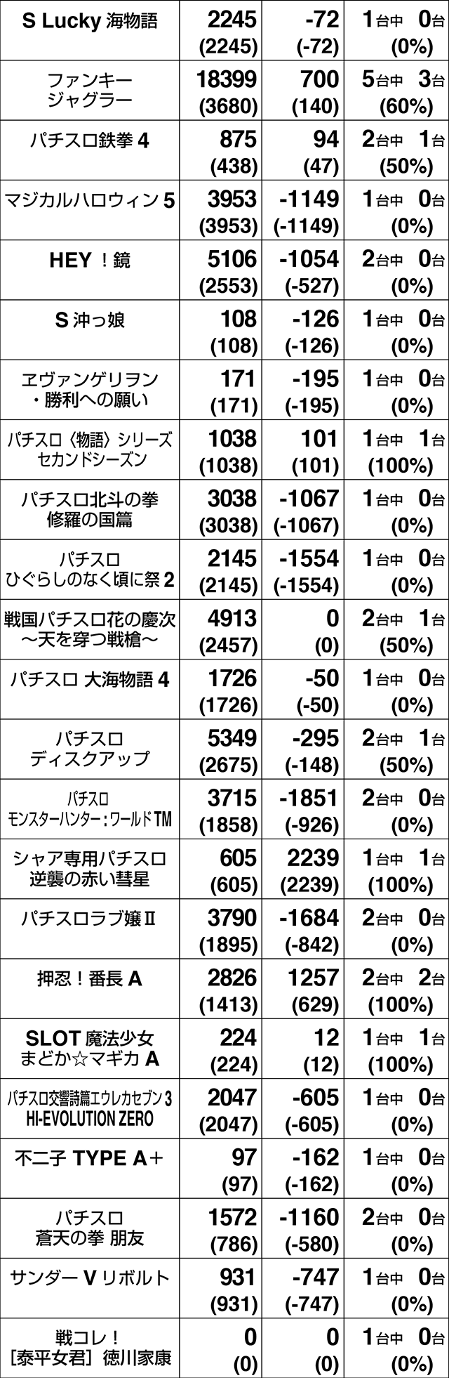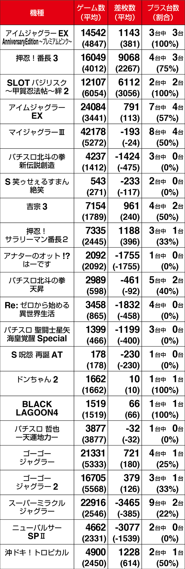 パチスロ全体ではプラス台の約4割にあたる19台が+1000ptオーバー。2台が+5000ptを超えた。