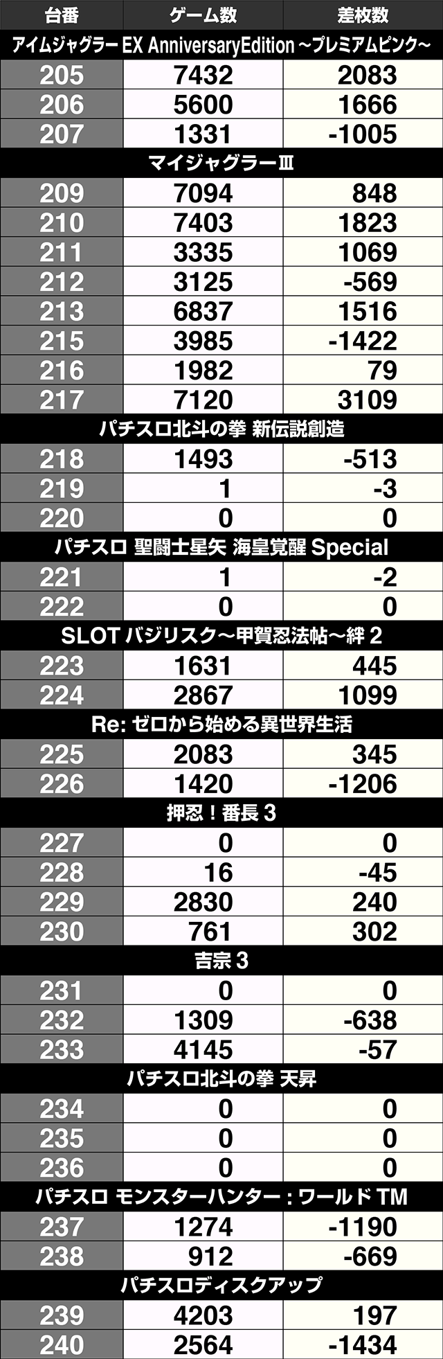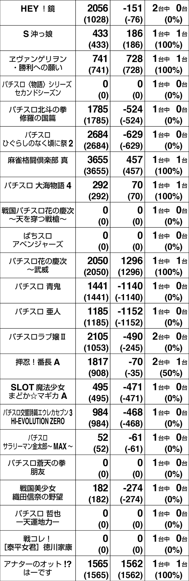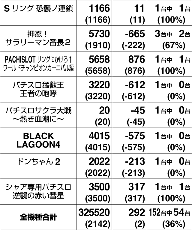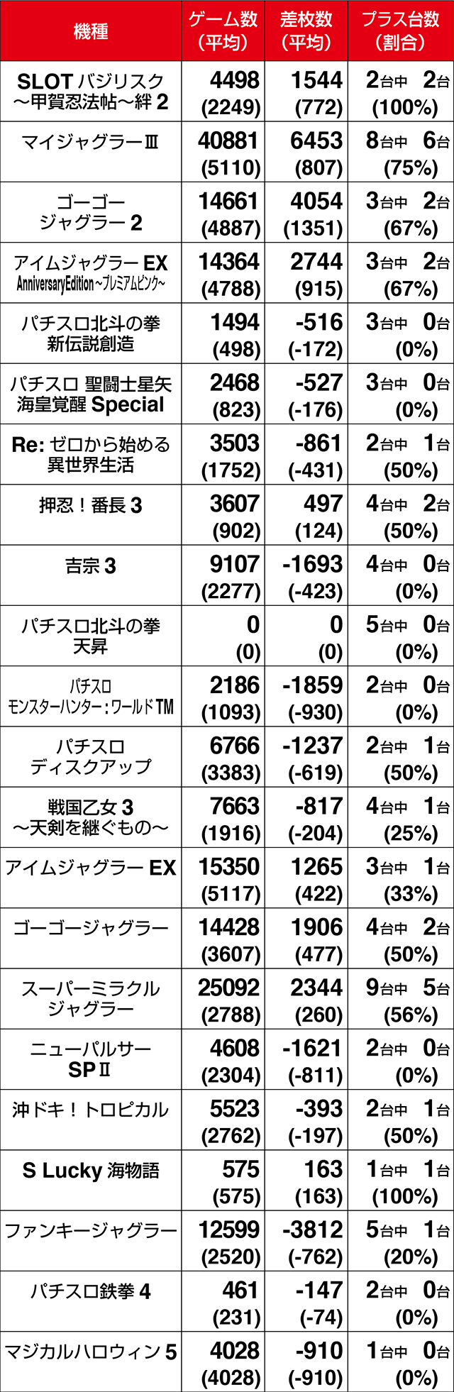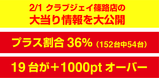 2月1日、「クラブジェイ篠路店」は、パチスロ全体で36%がプラス。トータルでの差枚数もプラスを記録した。4台以上設置されている機種は、11機種中7機種がプラス割合50%オーバー。プラスを記録した54台のうち、19台が+1000ptを上回り、5台は+2000ptを超えた。