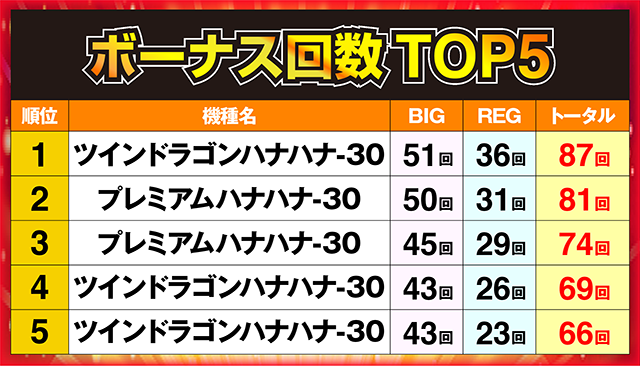 熾烈なトップ争いを制したのは、87回のボーナスに当選した「ツインドラゴンハナハナ-30」の1台だ。