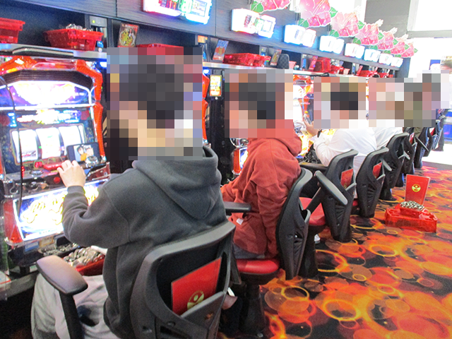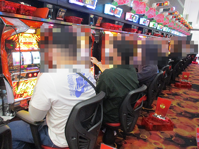 稼働率に比例するように、笑顔で遊技をおこなっているプレイヤーも多数。