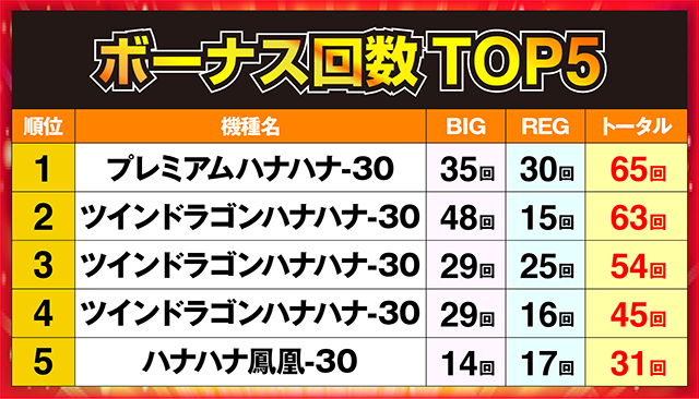 堂々の1位に輝いたのは、ボーナス回数65回を記録した「プレミアムハナハナ-30」の1台!