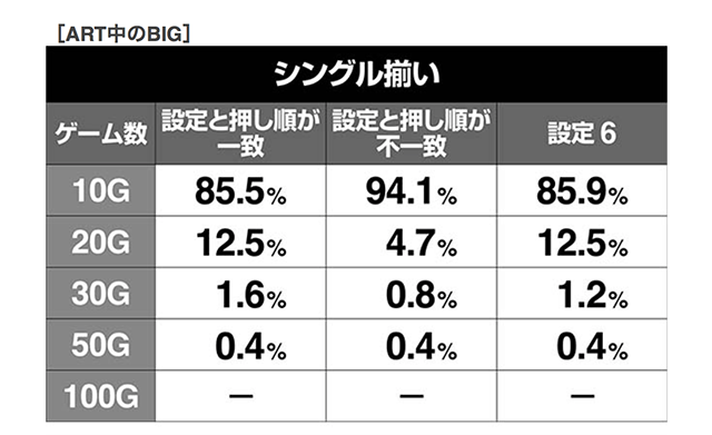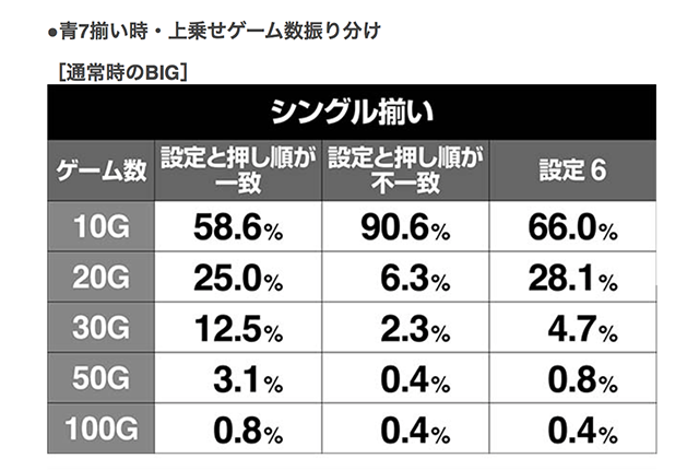 押し順正解時の上乗せゲーム数の振り分けにも設定差があり、押し順正解率と上乗せゲーム数の両方をあわせて設定推測を進めよう。