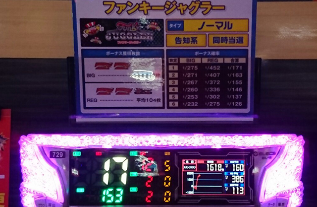 『ファンキージャグラー』では、ボーナス合算確率が1/120を上回っている台を目にした。