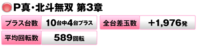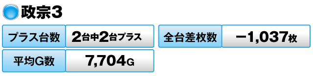 また、『政宗3』も挙動は悪くなかったが、全台差枚数は惜しくもマイナスに甘んじた。