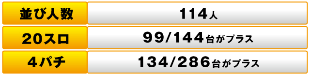 パチスロ全体では、144台中99台がプラスで、トータルの差枚数は+32,764枚という結果を記録した。