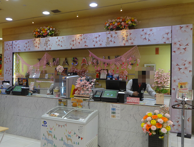 飲食店やジムが入った建物にあるホールであり、華やかな装飾によって、店内は明るい空間となっている。