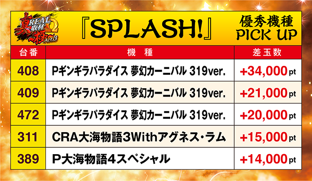 「CRA大海物語3Withアグネス・ラム」の311番台と「P大海物語4スペシャル」の389番台も含め、海物語シリーズの5台が+10,000ptを上回る結果を残した。
