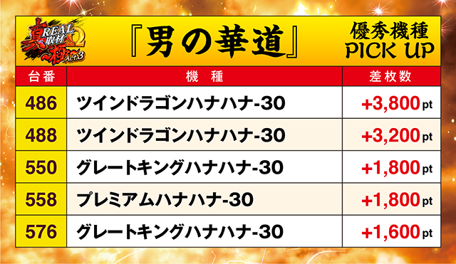 「ツインドラゴンハナハナ-30」が+3,000ptを超え、機種全体でもみてもプラス!