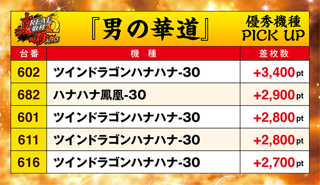 「ツインドラゴンハナハナ-30」の602番台は+3,000ptを上回った。