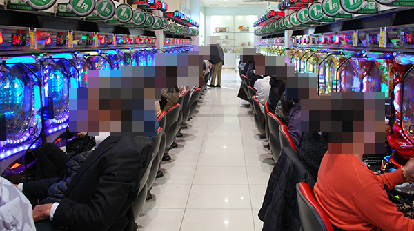 朝イチの様子をみるとパチスロが支持を受けており、「SLOT魔法少女まどか☆マギカ」や「パチスロ ガールズ&パンツァー」、「バジリスク~甲賀忍法帖~絆」などがすぐさま満席。