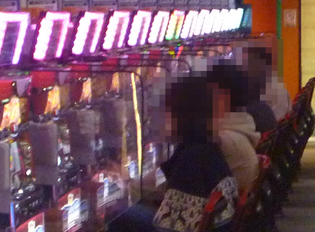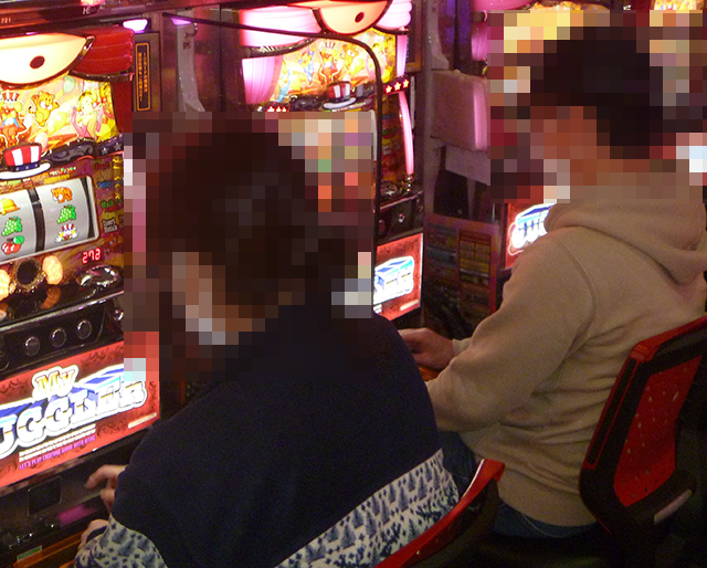 笑顔でレバーを叩いている姿が多く、パチスロ全体が楽しげな雰囲気に包まれていた。