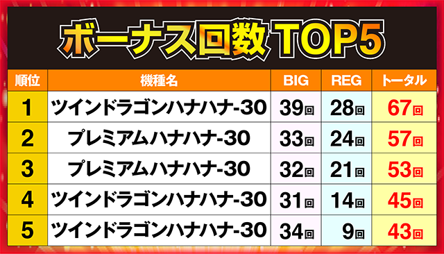 「ツインドラゴンハナハナ-30」からは3台がTOP5入りをはたし、ボーナス回数67回を記録した台が堂々の1位に輝いた。