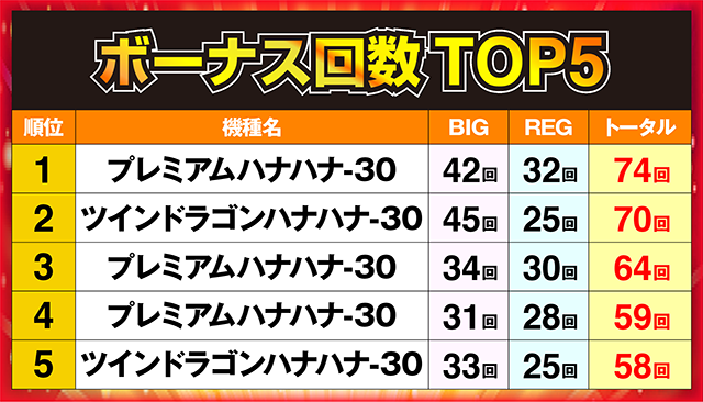 堂々の1位に輝いたのは「プレミアムハナハナ-30」の1台で、74回を記録した。