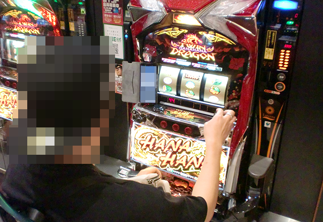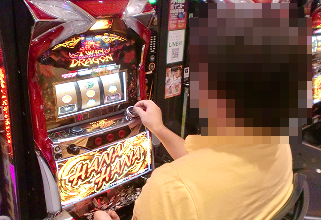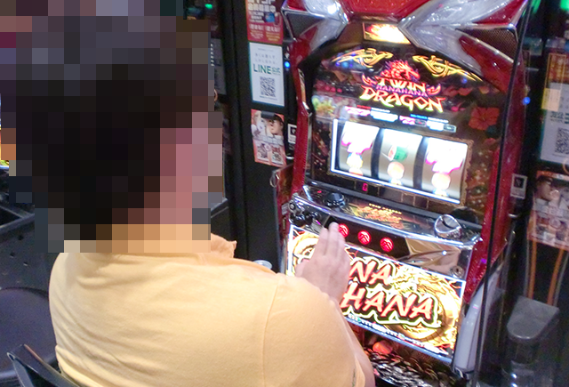 5台中3台が稼働し、どの台にも楽しげなプレイヤーの姿があった『ツインドラゴンハナハナ-30』。