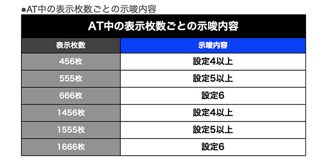 AT中の獲得枚数に法則があり、250枚の倍数以外で獲得枚数が表示されれば設定4以上が濃厚だ。